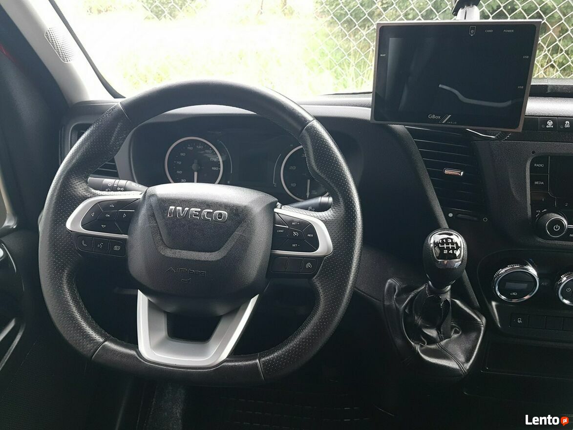 Klimatyzacja automatyczna – klimatronik. Tempomat. Ogrzewanie postojowe – Eberspacher. Wspomaganie kierownicy. Centralny zamek. Immobilizer. Komputer pokładowy. Poduszka powietrzna kierowcy. ABS. ASR. Elektryczne lusterka. Elektryczne szyby. Podgrzewane lusterka. Oryginalne Iveco Radio usb, aux + Bluetooth. Halogeny – funkcja doświetlania zakrętów. System kontroli trakcji. Asystent kierowcy. Automatyczny włącznik świateł – światła jazdy dziennej Led. Klimatyzowany schowek. Zegarek. Termometr zewnętrzny. Rozkładany stolik z fotela pasażera. Pneumatyczny fotel kierowcy. Regulacja wysokości fotela kierowcy. Regulacja kąta nachylenia siedziska fotela kierowcy. Regulacja lędźwiowa fotela kierowcy. Regulacja wysokości świateł. Regulacja położenia kierownicy. Regulacja wysokości pasów bezpieczeństwa. Podłokietnik. Schowki w desce rozdzielczej. Skórzana kierownica. Szerokie lusterka. Obrotomierz. Światła boczne obrysowe. Owiewki boczne kabiny. Kierunkowskazy w lusterkach. Schowki w bocznych drzwiach. Schowek pod fotelem pasażera. Srebrne dodatki. Koła R16C. Kabina 3 osoby. Tył koła bliźniaki. Koło zapasowe. Atermiczne szyby.