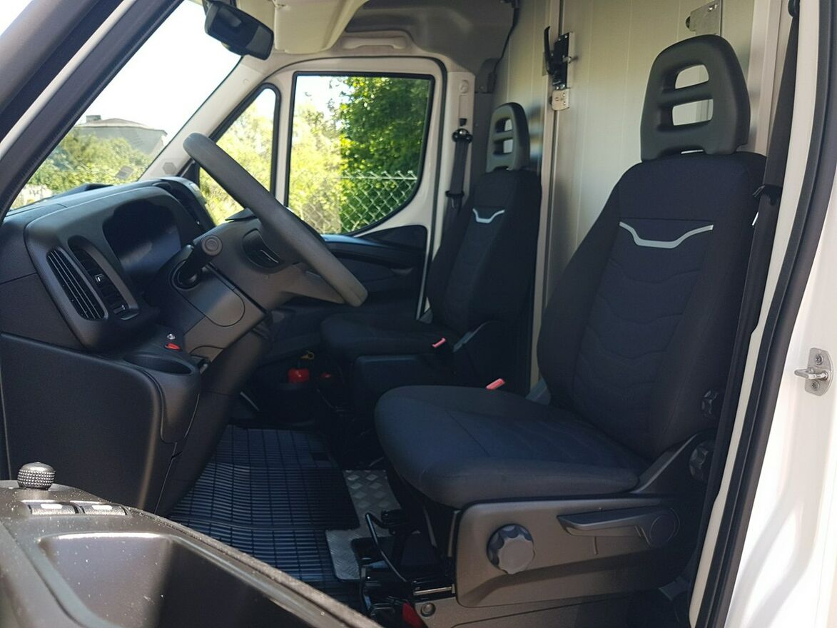 Klimatyzacja. Poduszka powietrzna kierowcy. Wspomaganie kierownicy. Centralny zamek. Immobilizer. ABS. ASR. Komputer pokładowy. Elektryczne lusterka. Elektryczne szyby. Podgrzewane lusterka. Obrotomierz. Oryginalne Iveco Radio usb, aux + Bluetooth. Funkcja City. System Start/Stop. System automatycznego zamykania drzwi. Kolorowa kamera cofania w lusterku wewnętrznym. Klimatyzowany schowek. Termometr zewnętrzny. Zegarek. Szerokie lusterka. Kierunkowskazy w lusterkach. Wielofunkcyjna kierownica. Schowki w desce rozdzielczej. Regulacja wysokości świateł. Regulacja położenia kierownicy. Podłokietnik fotela kierowcy. Regulacja lędźwiowa fotela kierowcy. Regulacja wysokości fotela kierowcy + pasażera. Regulacja kąta nachylenia siedziska fotela kierowcy + pasażera. Regulacja wysokości pasów bezpieczeństwa. Schowki w bocznych drzwiach. Automatyczny włącznik świateł – światła jazdy dziennej. Światła boczne obrysowe. Owiewka dachowa + boczne. Tylny podest wejścia na kontener. Koła R16C. Kabina 2 osoby. Koło zapasowe. Trzecie światło stop. Atermiczne szyby.
