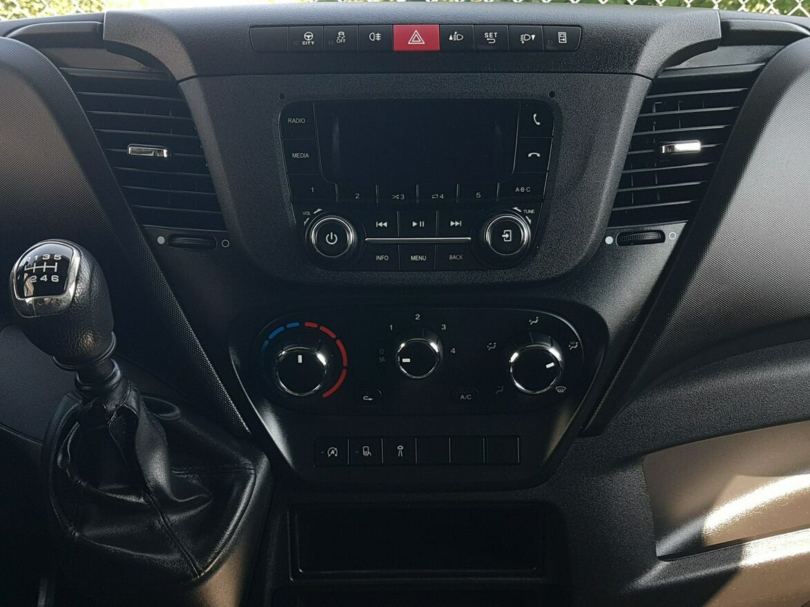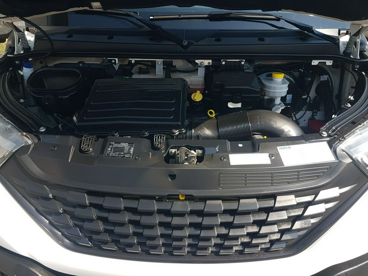 Klimatyzacja. Poduszka powietrzna kierowcy. Wspomaganie kierownicy. Centralny zamek. Immobilizer. ABS. ASR. Komputer pokładowy. Elektryczne lusterka. Elektryczne szyby. Podgrzewane lusterka. Obrotomierz. Oryginalne Iveco Radio usb, aux + Bluetooth. Funkcja City. System Start/Stop. System automatycznego zamykania drzwi. Kolorowa kamera cofania w lusterku wewnętrznym. Klimatyzowany schowek. Termometr zewnętrzny. Zegarek. Szerokie lusterka. Kierunkowskazy w lusterkach. Wielofunkcyjna kierownica. Schowki w desce rozdzielczej. Regulacja wysokości świateł. Regulacja położenia kierownicy. Podłokietnik fotela kierowcy. Regulacja lędźwiowa fotela kierowcy. Regulacja wysokości fotela kierowcy + pasażera. Regulacja kąta nachylenia siedziska fotela kierowcy + pasażera. Regulacja wysokości pasów bezpieczeństwa. Schowki w bocznych drzwiach. Automatyczny włącznik świateł – światła jazdy dziennej. Światła boczne obrysowe. Owiewka dachowa + boczne. Tylny podest wejścia na kontener. Koła R16C. Kabina 2 osoby. Koło zapasowe. Trzecie światło stop. Atermiczne szyby.